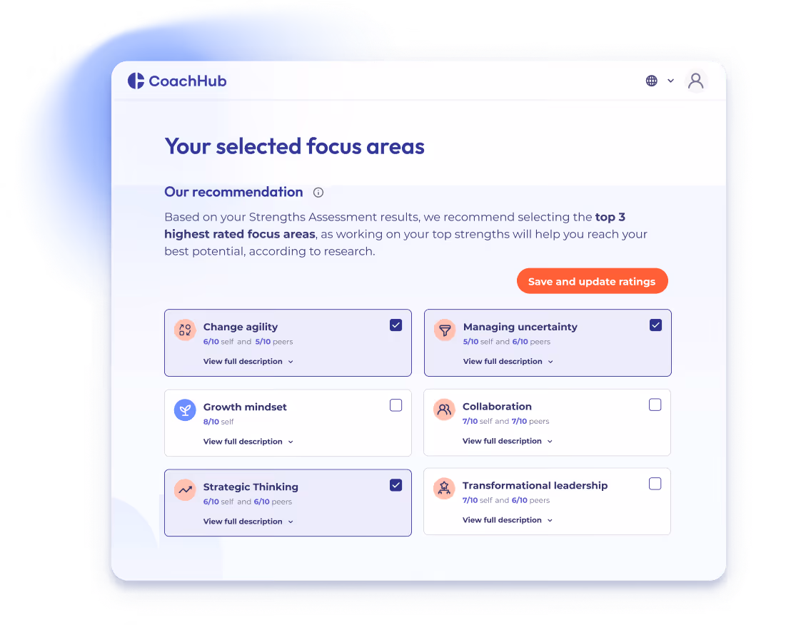 Das Entwicklungsprogramm von CoachHub konzentriert sich auf eine breite Palette von Fähigkeiten und auf die Entwicklung von Führungskompetenzen, wie zum Beispiel: