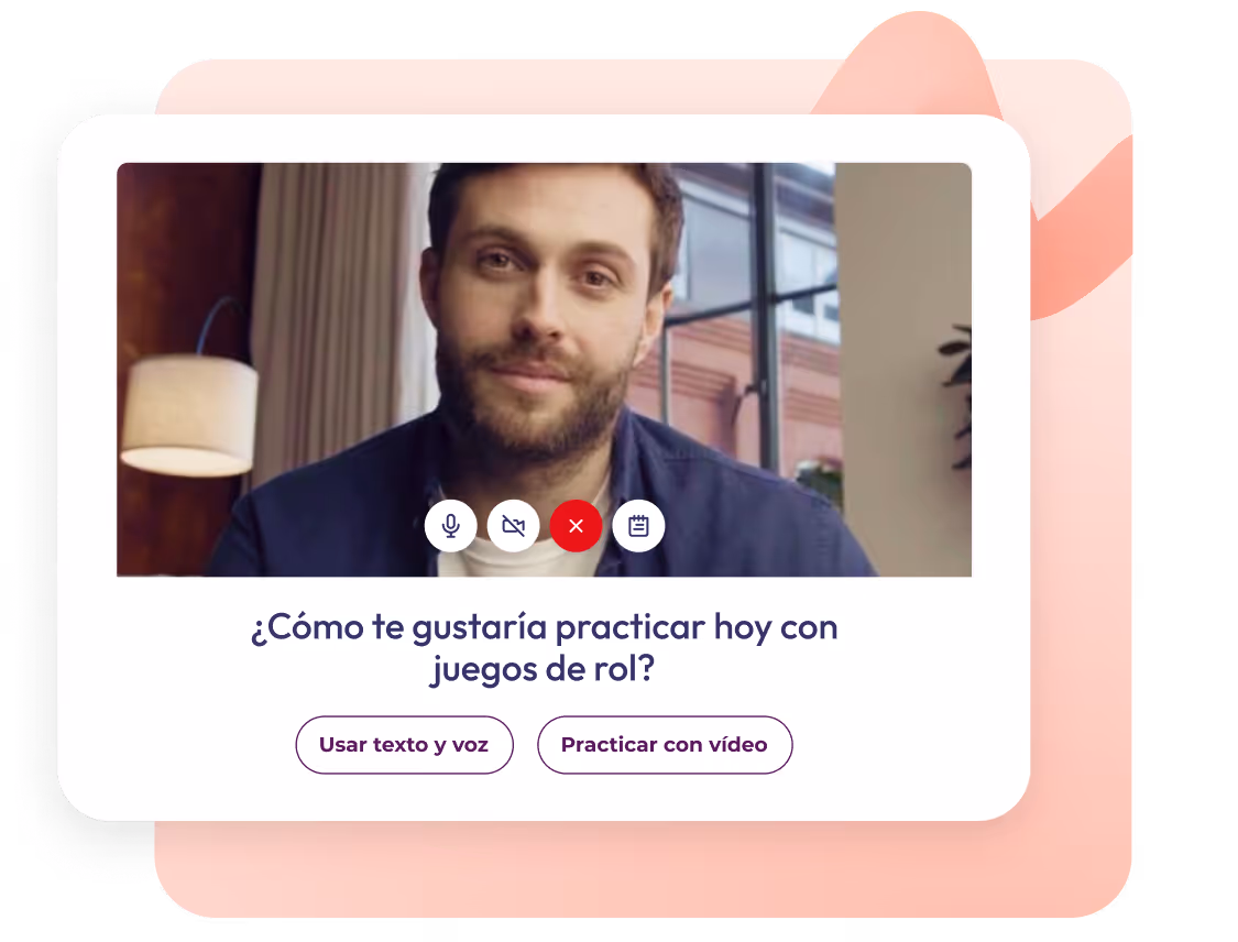 - Juegos de rol en vídeo para practicar conversacionesAIMY™ adopta el papel de un compañero, un mánager o un colaborador para simular conversaciones reales y ofrecer feedback que refuerza la confianza y la preparación.