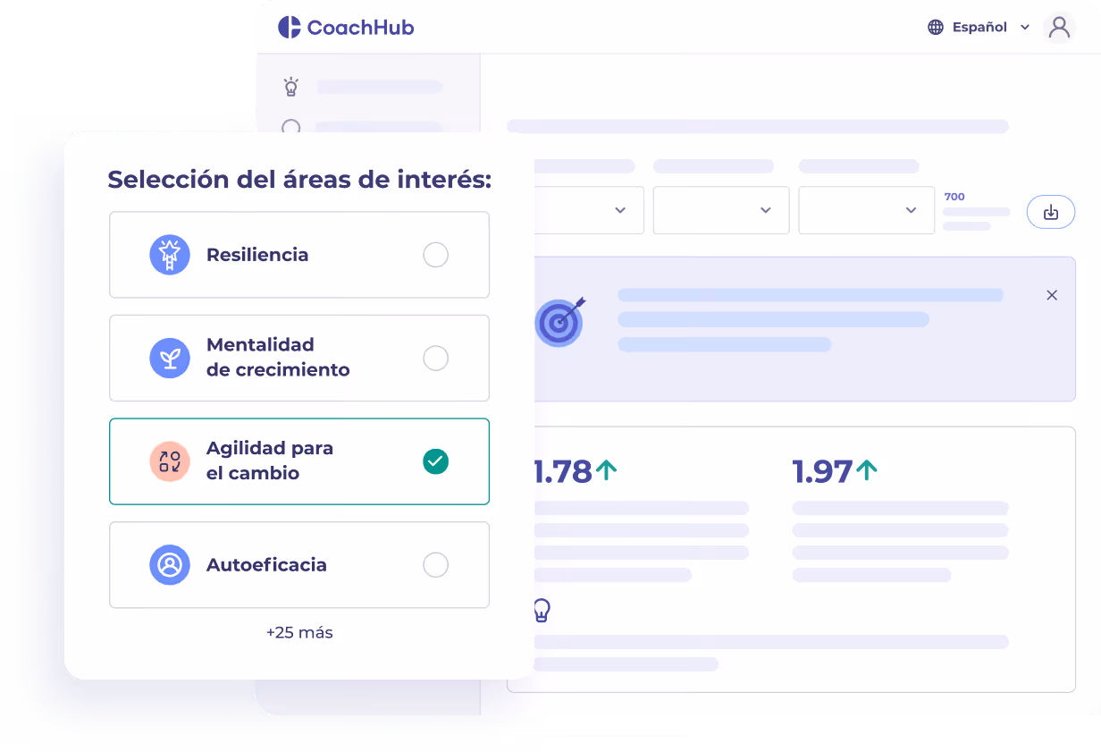 Observa de primera mano la progresión de las áreas de interés y los índices de satisfacción de tus coachees con nuestro rastreador en vivo.