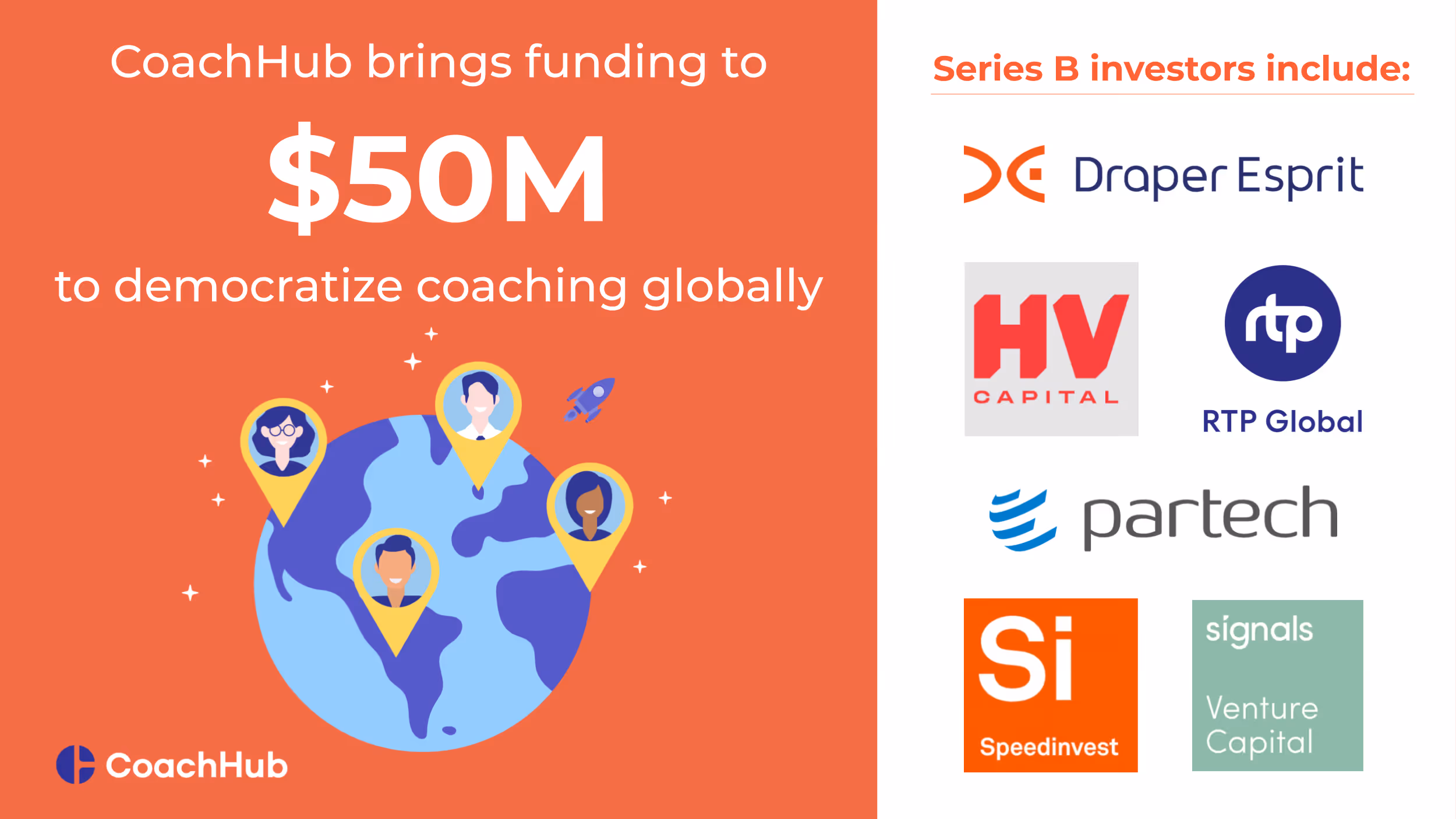 CoachHub è supportato dai principali investitori tecnologici europei, tra cui Draper Esprit, HV Capital, Partech, RTP Global, Venture Capital e Speedinvest.